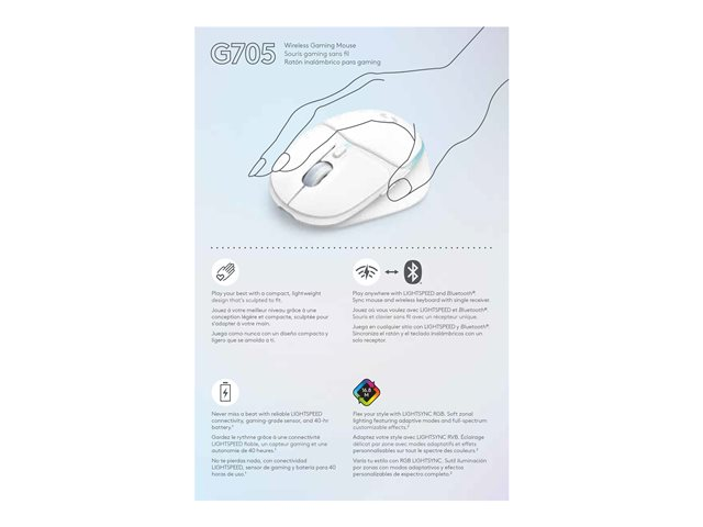 Den trådløse spillmusen G705 fra Aurora-kolleksjonen er formet for komfort og kontroll og har en design som er tilpasset mindre hender. Med trådløs LIGHTSPEED i spillkvalitet, LIGHTSYNC RGB og avansert spillteknologi.
