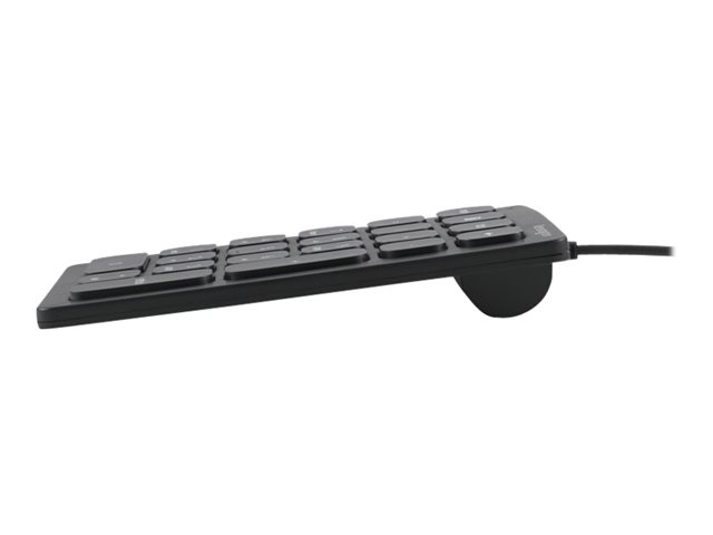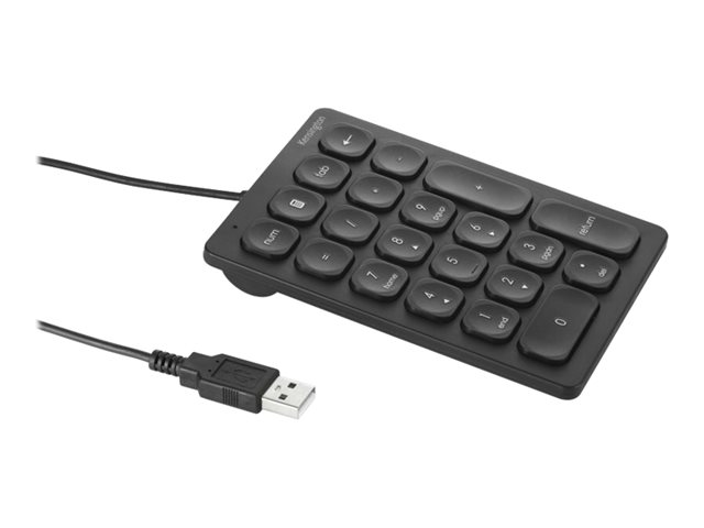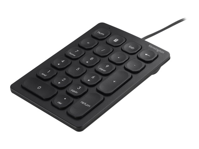 - Wired Numeric Keypad features 21 scissor keys with four shortcut keys, a Num Lock indicator, USB-A connectivity, and anti-slip foot pads