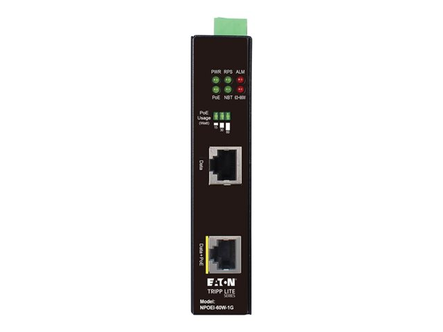 Eaton Tripp Lite Series Industrial Gigabit Ethernet PoE injector, 60W PoE++, 802.3bt, Midspan, -40C to +75C, IP30 housing, Dual 24~57VDC , DIN rail, 1 Port